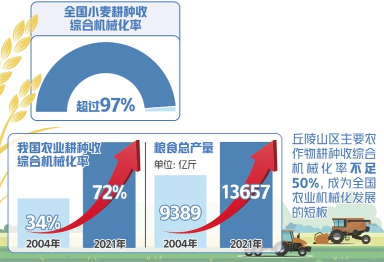 近年來,我國大力推進農業機械化、智能化發展,糧食生產基本實現了“機器換人”。全國小麥耕種收綜合機械化率超過97%,水稻、玉米、小麥耕種收綜合機械化率均超過80%。隨著農機化快速推進,全國糧食產量不斷躍上新臺階。2004年至2021年,我國農業耕種收綜合機械化率從34%躍升至72%,糧食總產量從9389億斤增長至13657億斤。