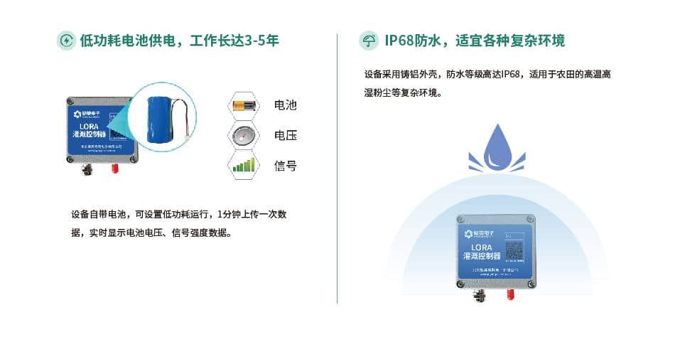 聚英LORA無線閥門控制器,專用于農業大田環境,產品使用LORA無線傳輸技術,最遠通訊距離3km,自帶鋰電池供電。針對農業中大田環境具有供電難度大,面積廣袤,布線成本高昂,維護成本高等特點。IP68防護等級,低功耗運行,通過 470Mhz射頻信號與智能網關通訊,可根據農作物對澆灌的不同要求,設定不同的澆灌策略,實現定制化、自動化澆灌。