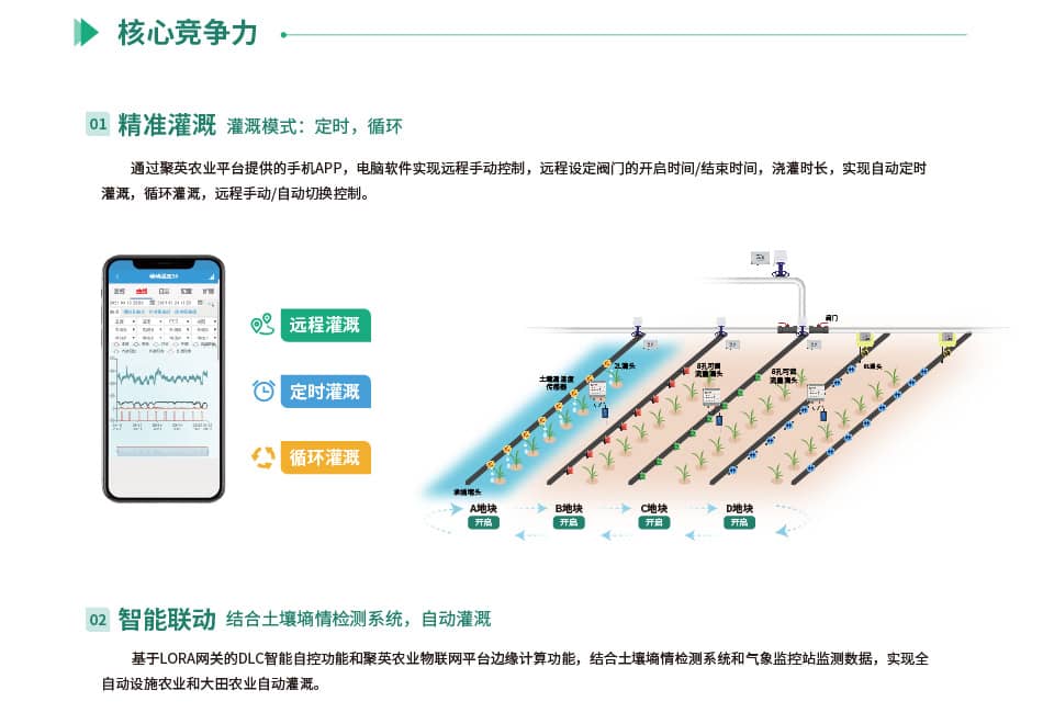 聚英大田農業灌溉系統基于LORA無線擴頻和4G/網絡通訊技術,使用LORA網關+LORA無線控制終端+LORA無線采集終端硬件設備,結合聚英農業物聯 網平臺,實現遠程不限距離數據采集,遠程控制功能。
