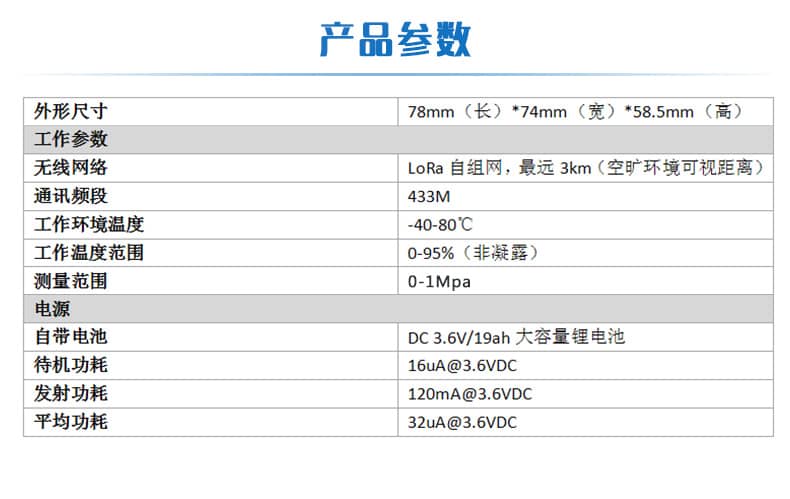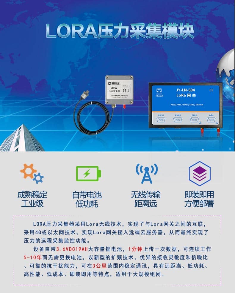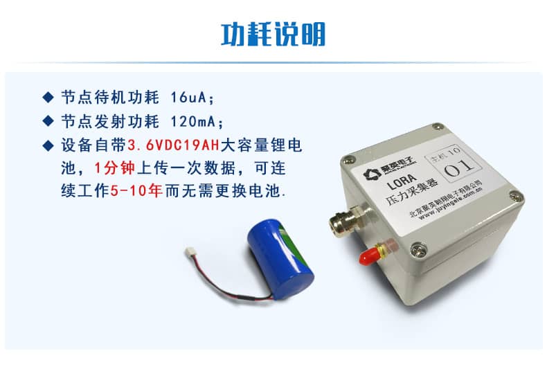 LORA壓力采集器自帶3.6VDC19AH大容量鋰電池,1分鐘上傳一次數據,可連續工作5-10年而無需更換電池,以新型的擴頻技術、優異的接收靈敏度和信噪比、可靠的抗干擾能力,可在3公里范圍內穩定通訊,具有遠距離、低功耗、高性能、低成本、即裝即用等特點,適用于大規模組網,適用于水利水電、石化、油井、電力、船舶、機床、管道等